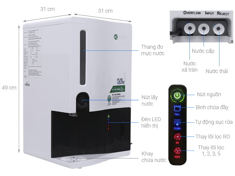 - Màn hình LED với hệ thống hiển thị tình trạng lõi lọc giúp cảnh báo thay lõi khi đến hạn.