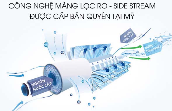 - Công nghệ màng lọc RO – Side Stream: giúp tăng thêm 66% lượng nước tinh khiết, giảm 56% lượng nước thải, kéo dài tuổi thọ màng lọc trung bình hơn 1,5 lần.