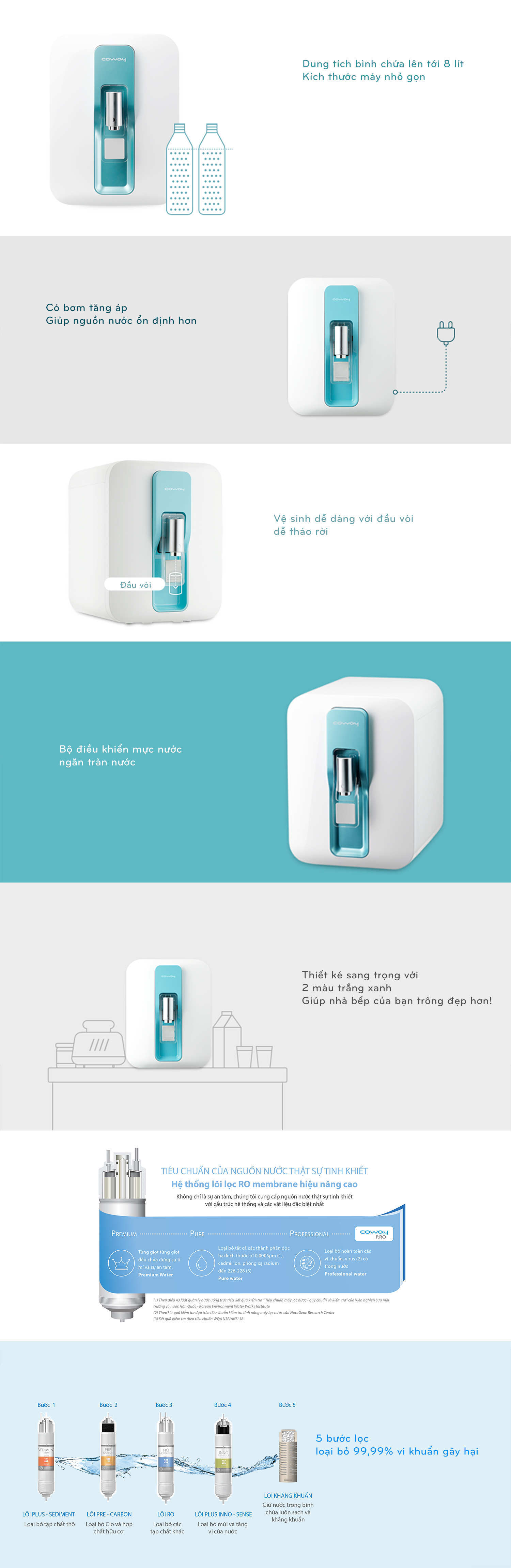 So với nhiều thiết bị lọc nước thường chỉ có 5 bước, đến công đoạn loại bỏ mùi hôi là kết thúc, thì công nghệ lọc của Coway tiên tiến hơn hẳn với việc ngăn chặn sự phát triển của vi sinh vật, rêu mốc. Hệ thống máy lọc nước của Coway được thực hiện gồm 6 bước với 5 lõi lọc luôn đem lại nguồn nước có chất lượng tốt nhất, đáp ứng tiêu chí " Loại bỏ hoàn toàn các tạp chất siêu nhỏ, đem lại nguồn nước tinh khiết nhất"