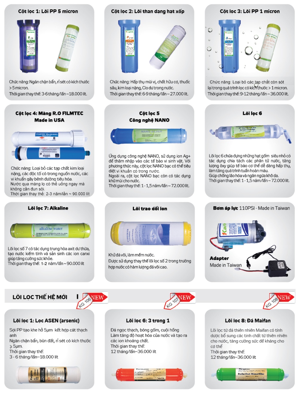 KG108H VTU sở hữu tới 8 cấp lọc khác nhau, bao gồm 3 lõi lọc thô, 1 màng Ro và 4 lõi lọc tinh cho nước uống an toàn và khỏe hơn.