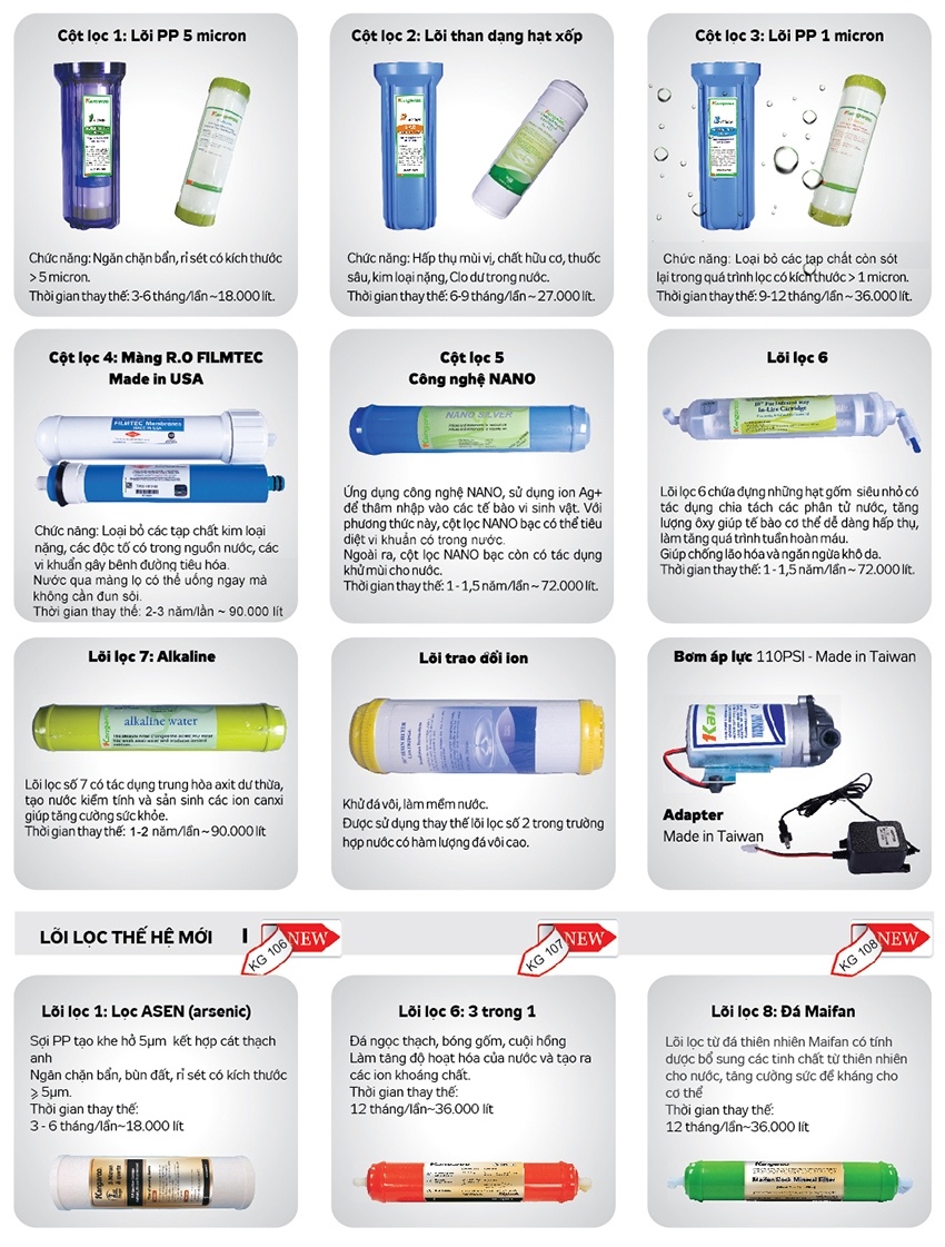 Sản phẩm gồm 9 cấp độ lọc, trang bị màng R.O Filmtec sản xuất từ Mỹ với công nghệ Nano Silver độc quyền giúp loại bỏ 99.9% vi khuẩn, tạp chất ô nhiễm trong nước. Đặc biệt, máy còn sử dụng thêm lõi lọc Omega - lõi khoáng đặc biệt tạo ion âm giúp cơ thể dễ hấp thu các khoáng chất, đào thải chất độc.