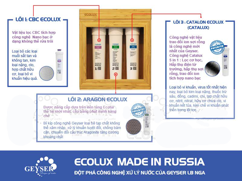 Ecolux là dòng máy lọc nước được ứng dụng những công nghệ mới về công nghệ vật liệu tiên tiến được nghiên cứu và phát minh bởi Geyser LB Nga, đó là các công nghệ: