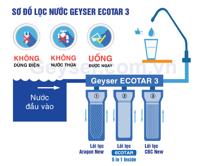 Geyser Ecotar 3 sử dụng các phiên bản lõi lọc mới nhất(Aragon New và BAF Ecotar ) và ECOTAR 5 in 1 tạo nên hơn 9 cơ chế lọc chỉ trong 3 lõi lọc.