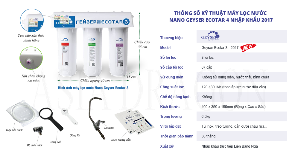 Máy lọc nước nano Geyser ECOTAR 3 là sản phẩm được nghiên cứu sản xuất riêng cho nguồn nước Việt Nam với khả năng tăng cường xử lý vượt trội so với các dòng máy lọc nước nano khác, đó là: