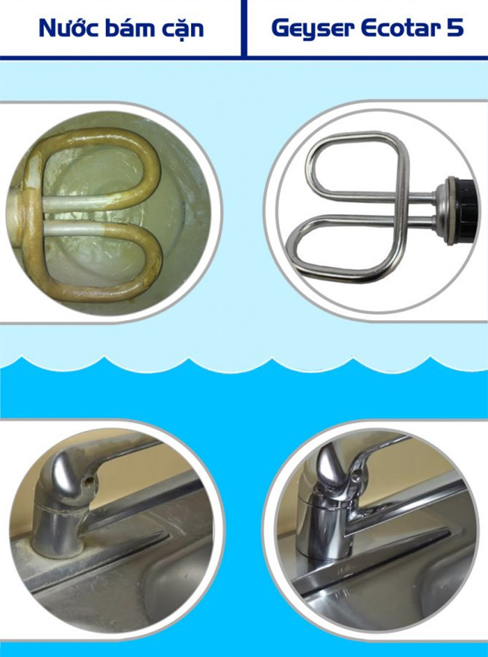 – Geyser Ecotar 5 không chỉ chống bám cặn, nhờ sử dụng hệ thống 3 lõi lọc liên hoàn được nâng cấp đặc biệt phù hợp nguồn nước Việt. Công nghệ giải quyết được bài toán khó về hiện tượng bám cặn của nguồn nước Việt ( Các thiết bị đun nấu, bình nóng lạnh, nồi hơi dễ bị bám cặn, nhanh làm hỏng sản phẩm, làm tiêu tốn điện năng và gia tăng chi phí…).
