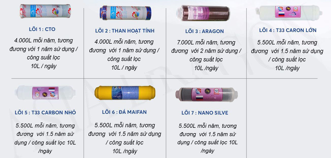 - Sử dụng lõi lọc Aragon mới với kích thước lọc 0,01 micron (Aragon cũ là 0,5 micron) và khả năng hấp thụ tốt hơn giúp loại bỏ các chất hữu cơ amoni, asen,