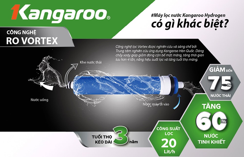 Lọc RO Vortex Kangaroo với ưu điểm: Tăng lưu lượng nước, nước phân bổ dọc thân màng, tối đa hóa hiệu suất lọc.