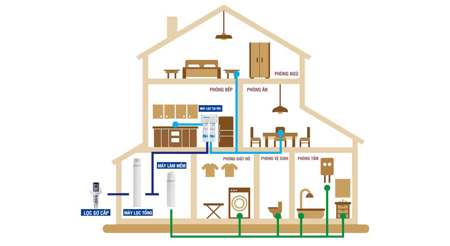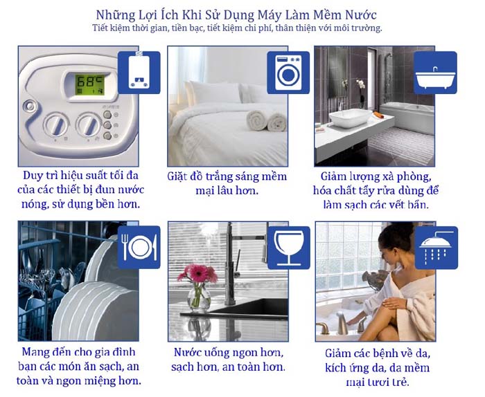 Hệ thống làm mềm nước sử dụng muối. Muối này chứa các ion Na+. Khi nước được cho qua hệ thống này, các ion Na+ sẽ thay thế các ion Ca+, Mg+… từ đó làm mềm nước. Nó đạt hiệu quả đến 99,6% trong việc ngăn ngừa sự tích tụ của các cặn Canxi, Magie trong các đường ống nước và các thiết bị trong gia đình bạn. Nó giúp làm tăng tuổi thọ cho các thiết bị.