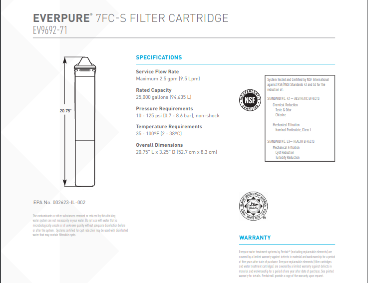 Sản phẩm Everpure 7FC-S EV9692-71 được chứng nhận NSF theo tiêu chuẩn NSF/ANSI 42 và 53, đảm bảo hiệu suất và chất lượng lọc nước tối ưu.