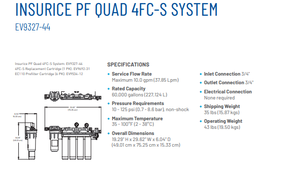 Nếu bạn quan tâm đến sức khỏe và muốn đảm bảo chất lượng nước uống tốt nhất cho gia đình hoặc doanh nghiệp của mình, hãy đặt mua Everpure EV9327-44 Insurice PF Quad 4FC-S System with Pre-Filter ngay hôm nay. Bạn sẽ không phải hối tiếc với quyết định của mình!