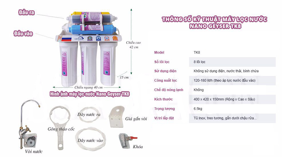 Máy lọc nước Nano Geyser TK8 là một trong những dòng máy đầu tiên của Geyser, đánh dấu sự phát triển về công nghệ lọc nước nano tại Việt Nam (công nghệ vật liệu lọc Aragon 4in1 nhập khẩu LB Nga được cấp bằng phát minh sáng chế ), được rất nhiều gia đình sử dụng để lọc nước nấu, uống với mức giá thành hợp lý, chất lượng đảm bảo, sử dụng cho nguồn nước máy sinh hoạt.