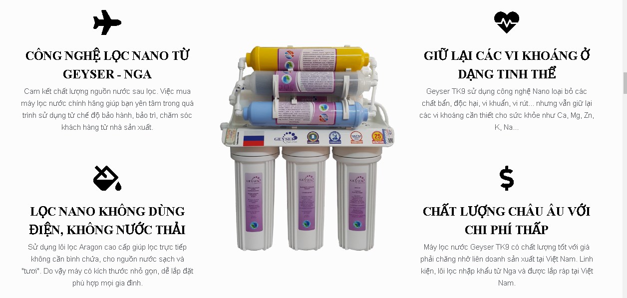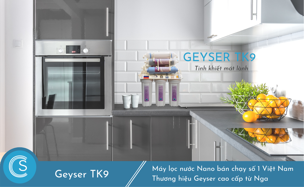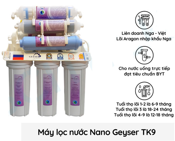 - Nano Geyser Tk9 ra đời đánh dấu sự phát triển về công nghệ lọc nước nano tại Việt Nam (công nghệ vật liệu lọc Aragon 4 in 1 nhập khẩu LB Nga được cấp bằng phát minh sáng chế ), được rất nhiều gia đình sử dụng để lọc nước nấu, uống với mức giá thành hợp lý, chất lượng đảm bảo, sử dụng cho nguồn nước máy sinh hoạt.