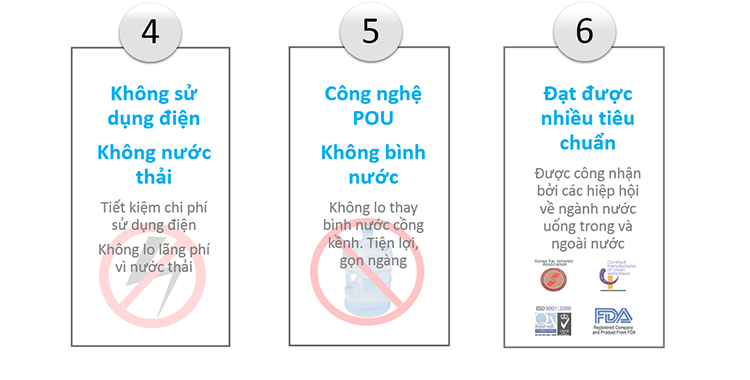 - Các khoáng chất thiên nhiên của nước có lợi cho sức khỏe hoàn toàn được giữ lại và đồng thời bổ sung thêm khoáng chất hữu cơ như Ca, K, Na, Mg… để bảo vệ sức khỏe bạn một cách toàn diện