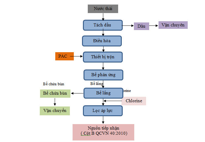 Nước thải rửa xe được đưa qua hệ thống song chắn rác để loại bỏ các vật thể có kích thước lớn sau đó được đưa đến bể tách dầu mỡ. Tại đây các lớp dầu có kích thước lớn sẽ nổi lên và định kỳ được vớt ra xử lý. Phần nước sau khi tách dầu mỡ được đưa sang bể lắng cát để tách các hạt cặn, đất, đá có kích thước lớn. Cặn sau lắng sẽ được định kỳ xả ra ngoài và đem ra sân phơi cát để xử lý.